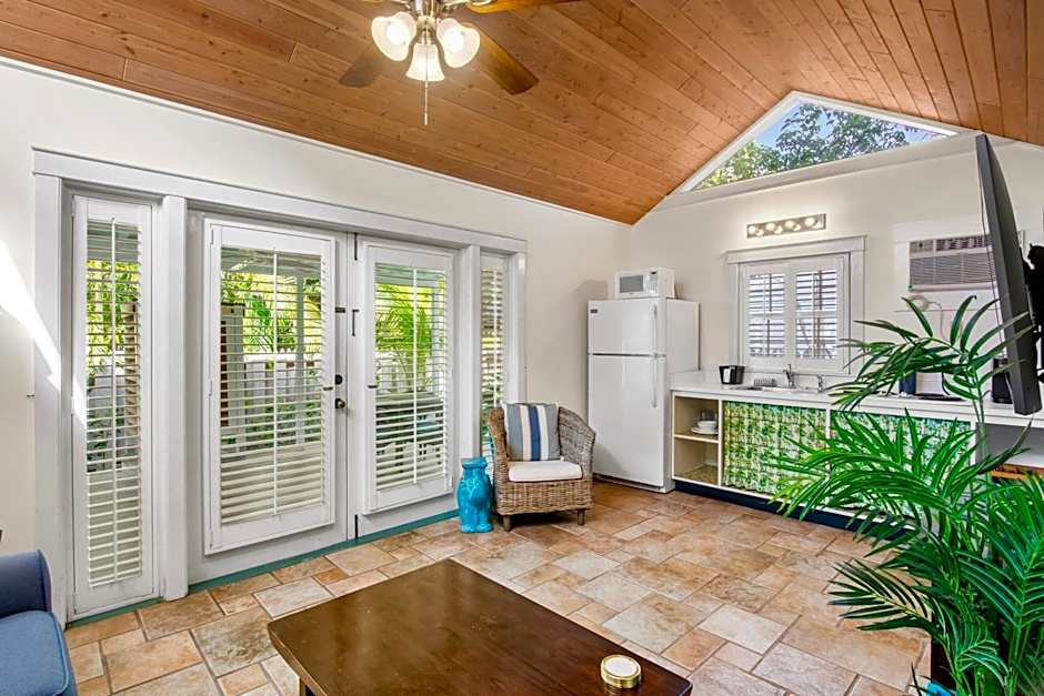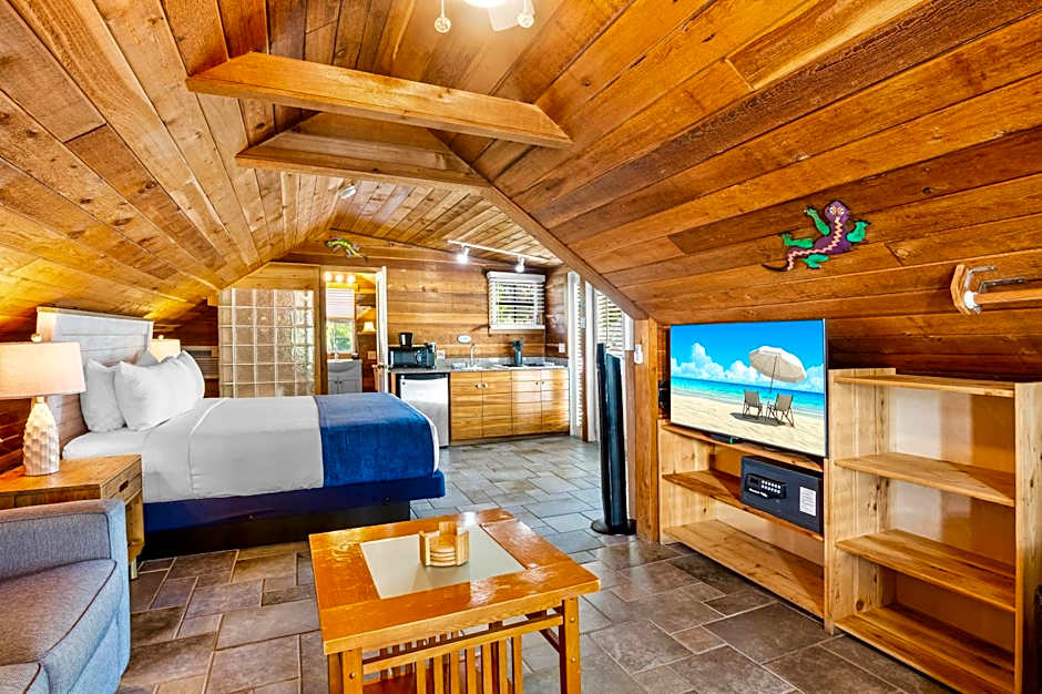 This spacious room includes a flat-screen TV, microwave, and refrigerator. It includes an extra large double bed and a patio area.